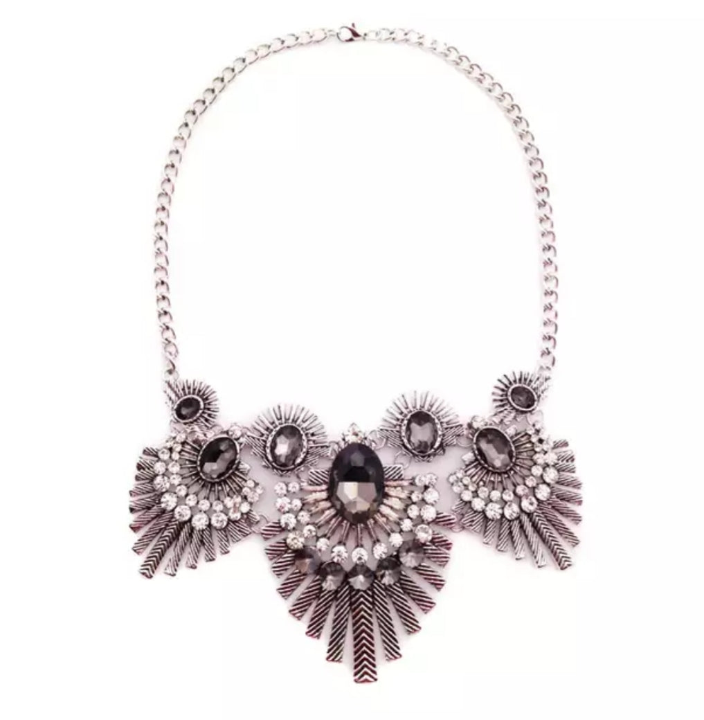 Robin Tribal statement necklace will give you a classic chic look. This Silver statement necklace features vintage jewel tone with silver.