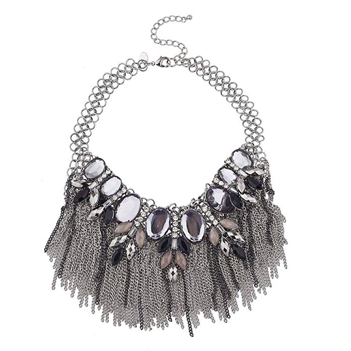 LeLe Fringe Bib chain statement necklace will give you a chic yet edgy look. This statement necklace features jewel tone with silver and chain fringe.